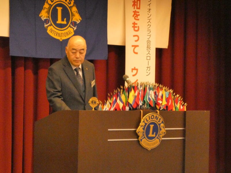 ライオンテーマ L林 伸樹の司会により開会後、会長 L小室 一征 開会ゴング、国家並びに